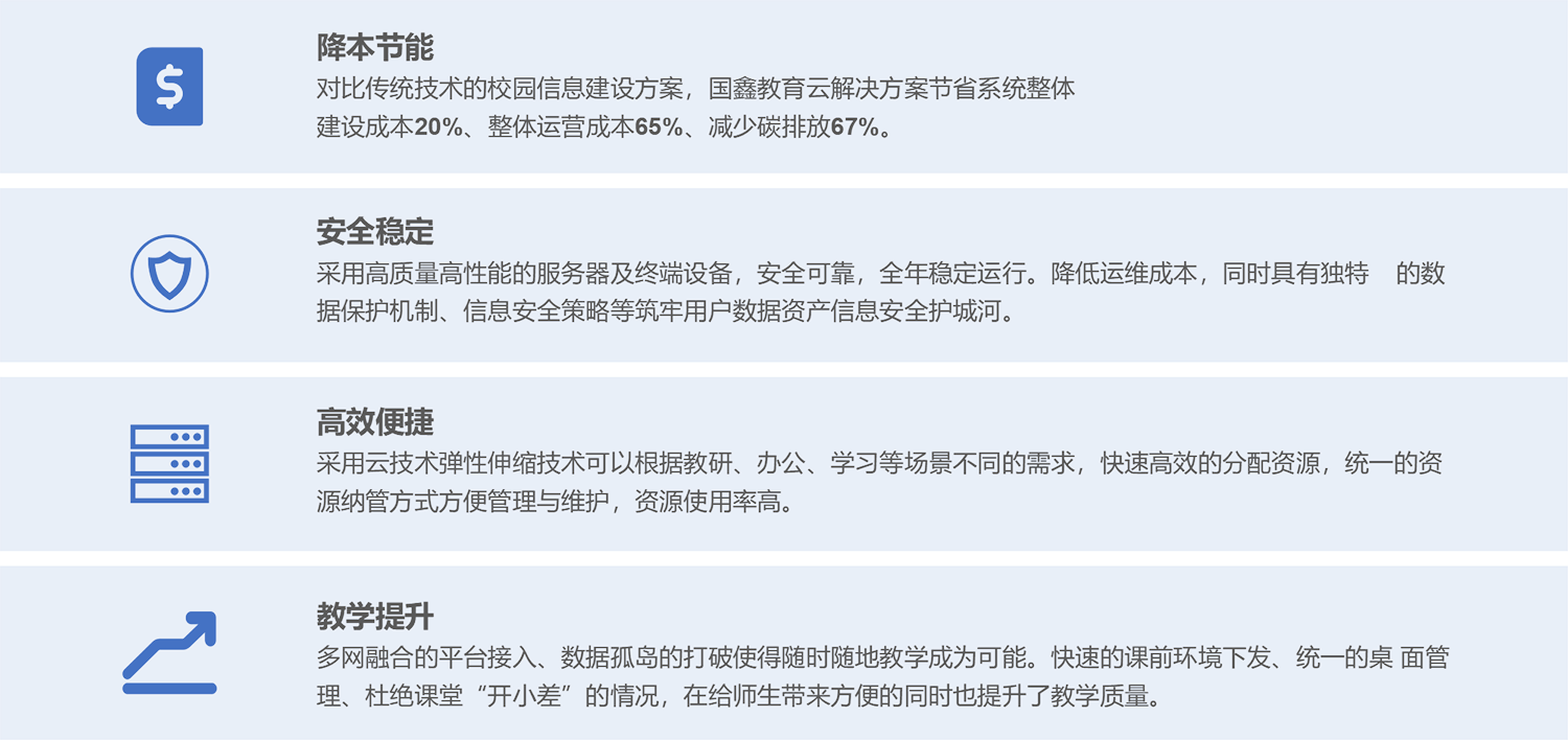 888集团 888教育云解决方案是针对教育业现状及遵循政策指导方向,采用自研国产硬件及自研软件平台,推出的教育行业云平台方案。方案基于云计算技术、互联网+战略格局、契合融合创新的思路,助力校园智慧建设,更好地为教育改革和开展给予信息化基础环境支撑。